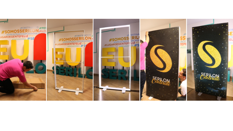 A foto abaixo mostra uma forma inovadora de utilizar esse material: aliando-o ao frame backlight: uma estrutura que serve como moldura para seu Tecido Backlight Premium. É prático: é possível montá-lo sozinho em minutos. É sofisticado: metálico, discreto e lindo.